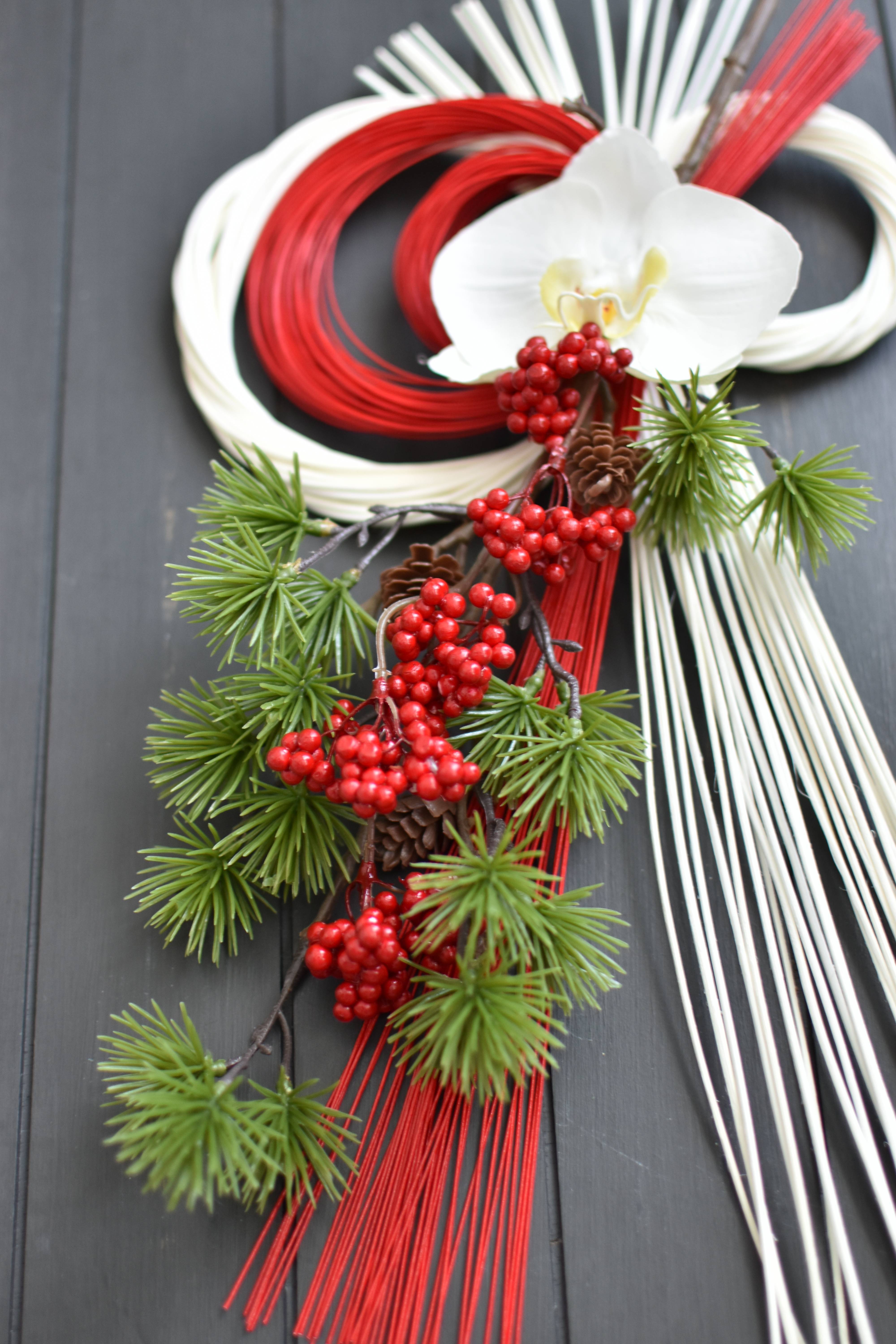 胡蝶蘭、松、南天、水引で仕上げました。