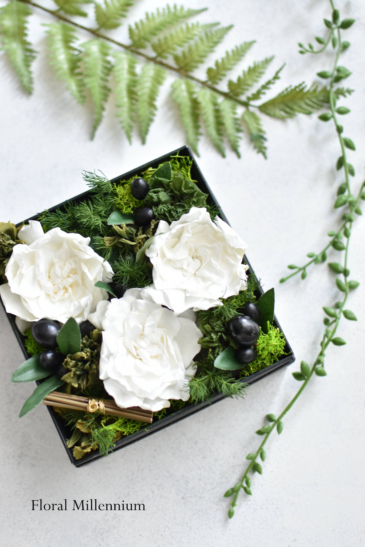 珍しいプリザーブドフラワーの真っ白なガーデニアを主役に